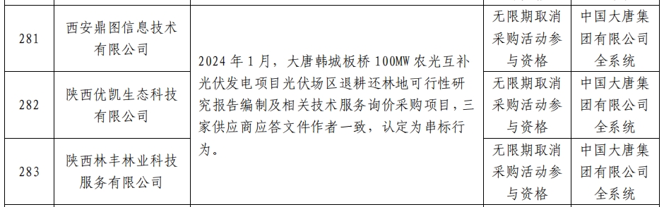 公告显示,2024 年 1 月,大唐韩城板桥 100MW 农光互补光伏发电项目光伏场区退耕还林地可行性研究报告编制及相关技术服务询价采购项目,西安鼎图信息技术有限公司、陕西优凯生态科技有限公司、陕西林丰林业科技服务有限公司应答文件作者一致,认定为串标行为。