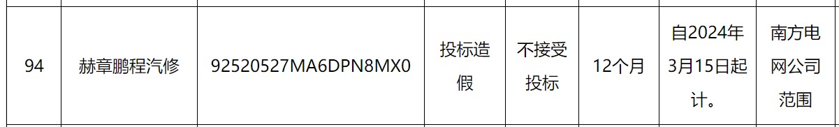其中,赫章鹏程汽修因被南方电网认定投标造假,处理措施为不接受投标,处理期限为自2024年3月15日起计12个月。