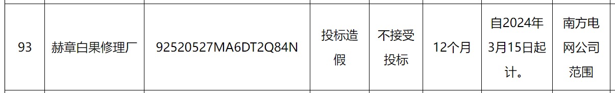其中,赫章白果修理厂因被南方电网认定投标造假,处理措施为不接受投标,处理期限为自2024年3月15日起计12个月。