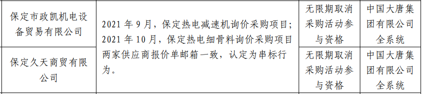 因上述行为,两家供应商被中国大唐集团有限公司全系统无限期取消采购活动参与资格。