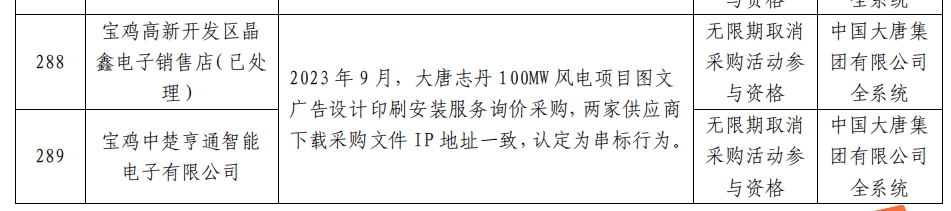 公告显示,2023 年 9 月,大唐志丹 100MW 风电项目图文广告设计印刷安装服务询价采购,宝鸡高新开发区晶鑫电子销售店(已处理)与宝鸡中楚亨通智能电子有限公司下载采购文件 IP 地址一致,认定为串标行为。