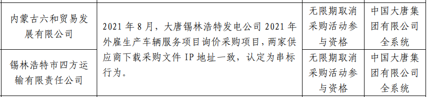 公告显示,2021年8月,大唐锡林浩特发电公司2021年外雇生产车辆服务项目询价采购项目,内蒙古六和贸易发展有限公司与锡林浩特市四方运输有限责任公司两家供应商下载采购文件IP地址一致,认定为串标行为。