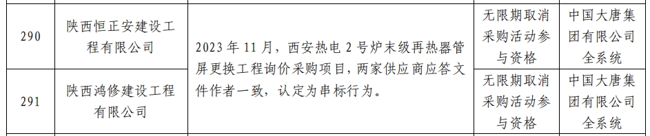 公告显示,2023年11月,西安热电2号炉末级再热器管屏更换工程询价采购项目,陕西恒正安建设工程有限公司与陕西鸿修建设工程有限公司应答文件作者一致,认定为串标行为。