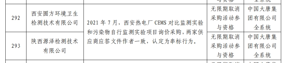 公告显示,2021年7月,西安热电厂CEMS对比监测实验和污染物自行监测实验项目询价采购,西安圆方环境卫生检测技术有限公司以及陕西源泽检测技术 有限公司应答文件作者一致,认定为串标行为。