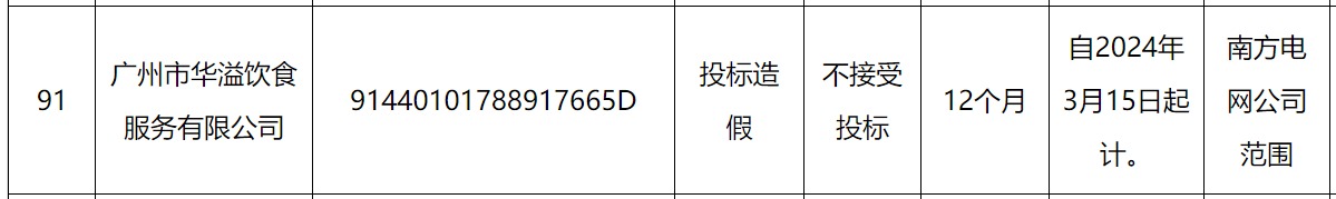 其中,广州市华溢饮食服务有限公司因被南方电网认定投标造假,处理措施为不接受投标,处理期限为自2024年3月15日起计12个月。