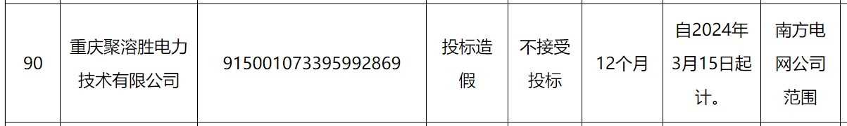 其中,重庆聚溶胜电力技术有限公司因被南方电网认定投标造假,处理措施为不接受投标,处理期限为自2024年3月15日起计12个月。
