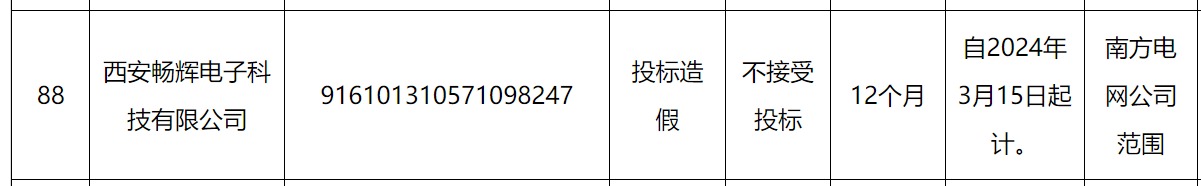 其中,西安畅辉电子科技有限公司因被南方电网认定投标造假,处理措施为不接受投标,处理期限为自2024年3月15日起计12个月。