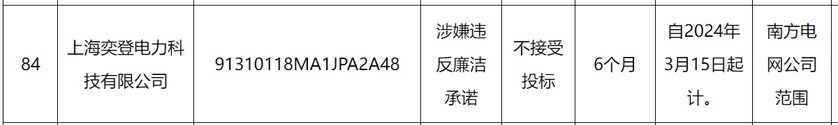 其中,上海奕登电力科技有限公司因被南方电网认定涉嫌违反廉洁承诺,处理措施为不接受投标,处理期限为自2024年3月15日起计6个月。