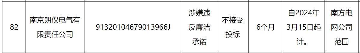 其中,南京朗仪电气有限责任公司因被南方电网认定涉嫌违反廉洁承诺,处理措施为不接受投标,处理期限为自2024年3月15日起计6个月。
