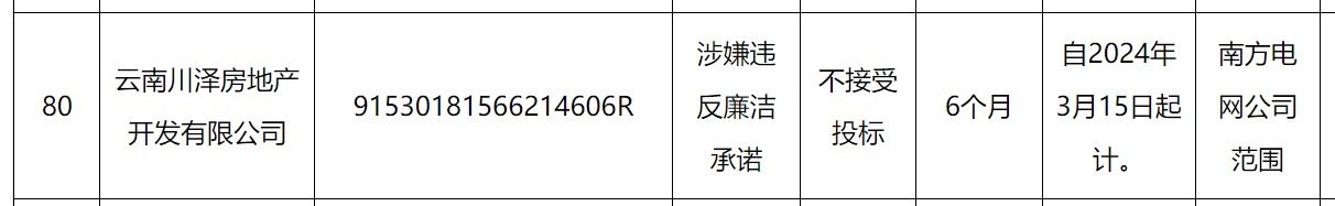 其中,云南川泽房地产开发有限公司因被南方电网认定涉嫌违反廉洁承诺,处理措施为不接受投标,处理期限为自2024年3月15日起计6个月。