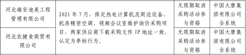 因上述行为,两家供应商被中国大唐集团有限公司全系统无限期取消采购活动参与资格。