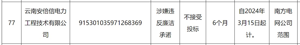 其中,云南安倍信电力工程技术有限公司因被南方电网认定涉嫌违反廉洁承诺,处理措施为不接受投标,处理期限为自2024年3月15日起计6个月。