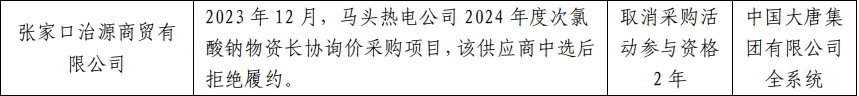 公告显示,2023 年 12 月,马头热电公司2024 年度次氯酸钠物资长协询价采购项目,该供应商中选后拒绝履约。