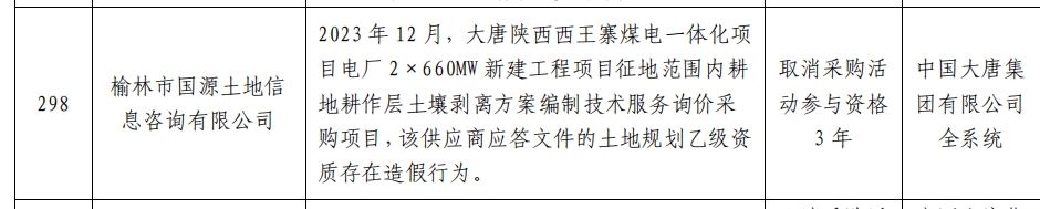 公告显示,2023年12月,大唐陕西西王寨煤电一体化项目电厂 2×660MW 新建工程项目征地范围内耕地耕作层土壤剥离方案编制技术服务询价采购项目,榆林市国源土地信息咨询有限公司文件的土地规划乙级资质存在造假行为。