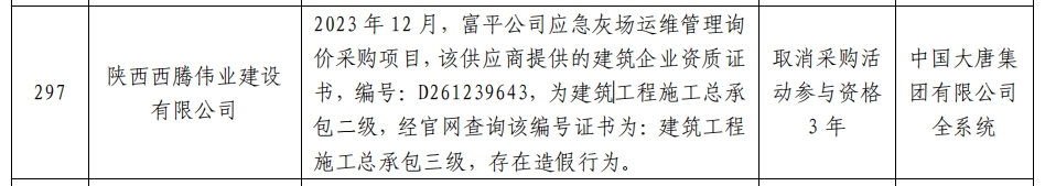公告显示,2023年12月,富平公司应急灰场运维管理询价采购项目,陕西西腾伟业建设有限公司 提供的建筑企业资质证书,编号:D261239643,为建筑工程施工总承包二级,经官网查询该编号证书为:建筑工程施工总承包三级,存在造假行为。