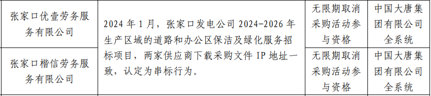 公告显示,2024 年 1 月,张家口发电公司 2024-2026年生产区域的道路和办公区保洁及绿化服务招标项目,张家口优壹劳务服务有限公司与张家口楷信劳务服务有限公司两家供应商下载采购文件IP地址一 致,认定为串标行为。