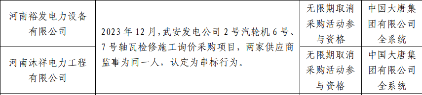 公告显示,2023 年 12 月,武安发电公司 2 号汽轮机 6 号、 7 号轴瓦检修施工询价采购项目,河南裕发电力设备有限公司与河南沐祥电力工程有限公司两家供应商监事为同一人,认定为串标行为。