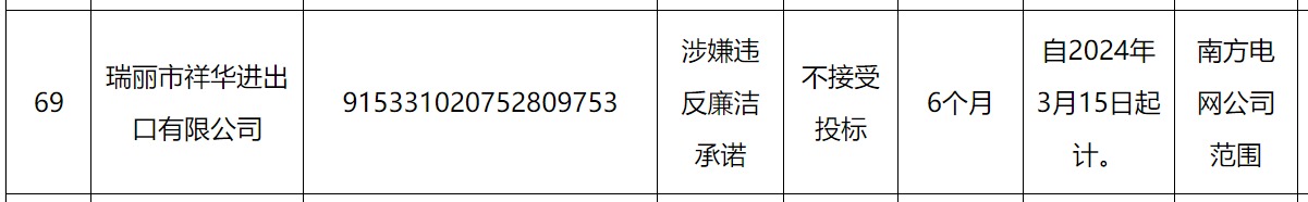 其中,瑞丽市祥华进出口有限公司因被南方电网认定涉嫌违反廉洁承诺,处理措施为不接受投标,处理期限为自2024年3月15日起计6个月。