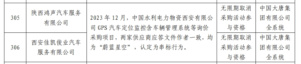 公告显示,2023 年 12 月,中国水利电力物资西安有限公司 GPS 汽车定位监控含车辆管理系统等询价采购项目,陕西鸿声汽车服务有限公司以及西安佳凯俊业汽车服务有限公司两家供应商应答文件作者一致,均为“蔚蓝星空”,认定为串标行为。