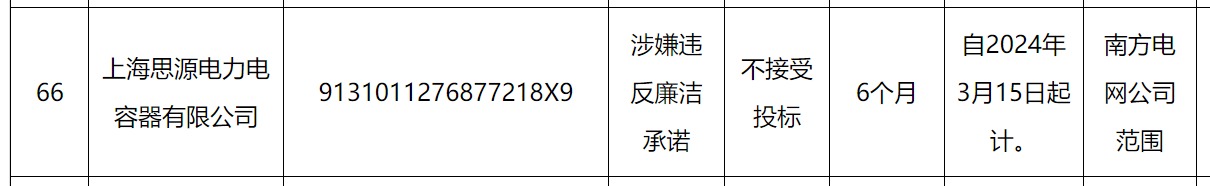 其中,上海思源电力电容器有限公司因被南方电网认定涉嫌违反廉洁承诺,处理措施为不接受投标,处理期限为自2024年3月15日起计6个月。