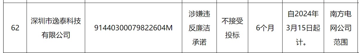 其中,深圳市逸泰科技有限公司因被南方电网认定涉嫌违反廉洁承诺,处理措施为不接受投标,处理期限为自2024年3月15日起计6个月。