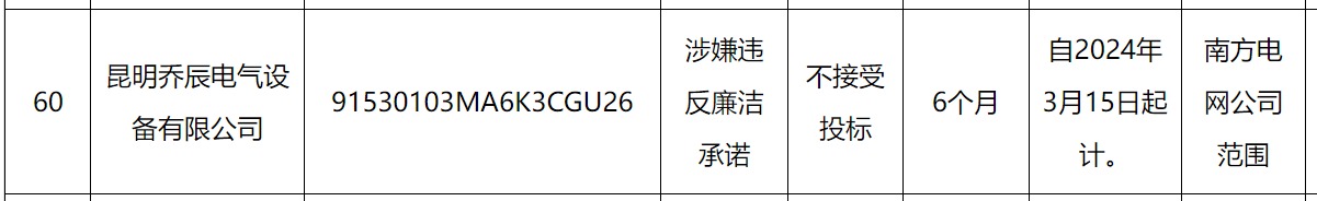 其中,昆明乔辰电气设备有限公司因被南方电网认定涉嫌违反廉洁承诺,处理措施为不接受投标,处理期限为自2024年3月15日起计6个月。
