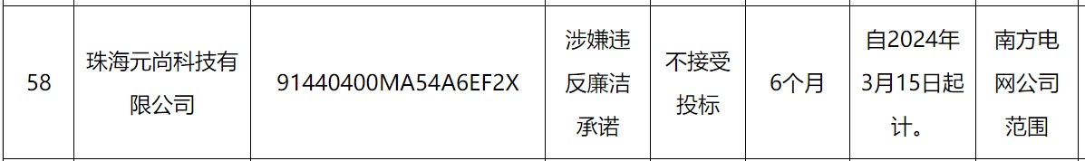 其中,珠海元尚科技有限公司因被南方电网认定涉嫌违反廉洁承诺,处理措施为不接受投标,处理期限为自2024年3月15日起计6个月。