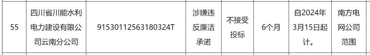 其中,四川省川能水利电力建设有限公司云南分公司因被南方电网认定涉嫌违反廉洁承诺,处理措施为不接受投标,处理期限为自2024年3月15日起计6个月。