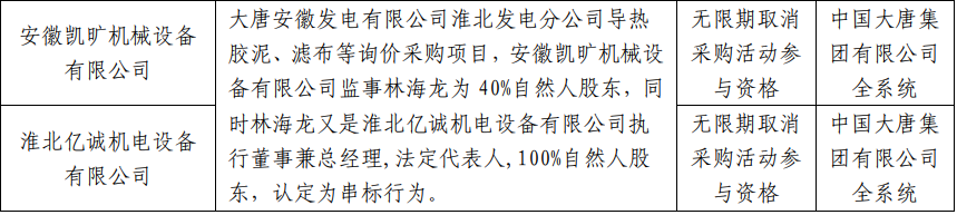 因上述行为,两家供应商被中国大唐集团有限公司全系统无限期取消采购活动参与资格。