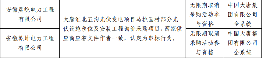 公告显示,大唐淮北五沟光伏发电项目马桃园村部分光伏设施移位及安装工程询价采购项目,安徽晨皖电力工程有限公司以及安徽乾坤电力工程有限公司两家供应商应答文件作者一致,认定为串标行为。