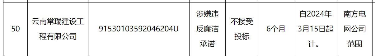 其中,云南常瑞建设工程有限公司因被南方电网认定涉嫌违反廉洁承诺,处理措施为不接受投标,处理期限为自2024年3月15日起计6个月。