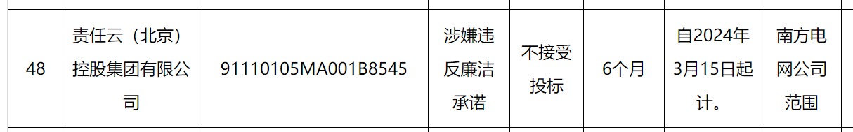 其中,责任云(北京)控股集团有限公司因被南方电网认定涉嫌违反廉洁承诺,处理措施为不接受投标,处理期限为自2024年3月15日起计6个月。