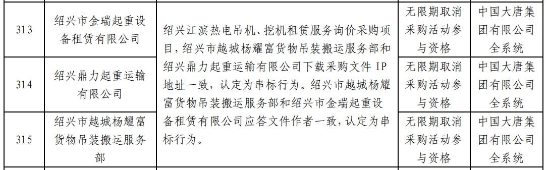 公告显示,绍兴江滨热电吊机、挖机租赁服务询价采购项目,绍兴市越城杨耀富货物吊装搬运服务部和绍兴鼎力起重运输有限公司下载采购文件 IP 地址一致,认定为串标行为。绍兴市越城杨耀 富货物吊装搬运服务部和绍兴市金瑞起重设备租赁有限公司应答文件作者一致,认定为串标行为。