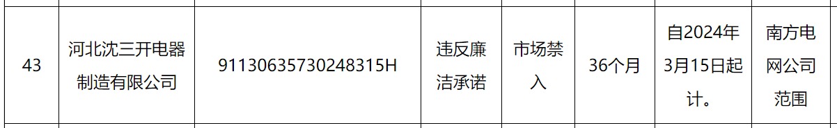其中,河北沈三开电器制造有限公司因被南方电网认定违反廉洁承诺市场禁入,处理期限为自2024年3月15日起计36个月。
