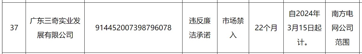 其中,广东三奇实业发展有限公司因被南方电网认定违反廉洁承诺市场禁入,处理期限为自2024年3月15日起计22个月。