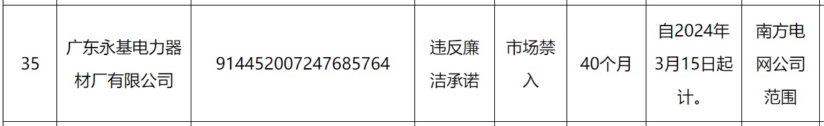 其中,广东永基电力器材厂有限公司因被南方电网认定违反廉洁承诺市场禁入,处理期限为自2024年3月15日起计40个月。