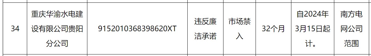 其中,重庆华渝水电建设有限公司贵阳分公司因被南方电网认定违反廉洁承诺市场禁入,处理期限为自2024年3月15日起计32个月。