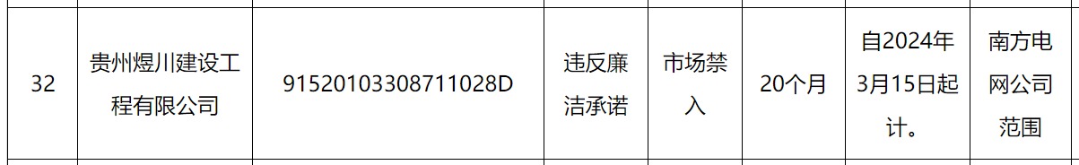 其中,贵州煜川建设工程有限公司因被南方电网认定违反廉洁承诺市场禁入,处理期限为自2024年3月15日起计20个月。