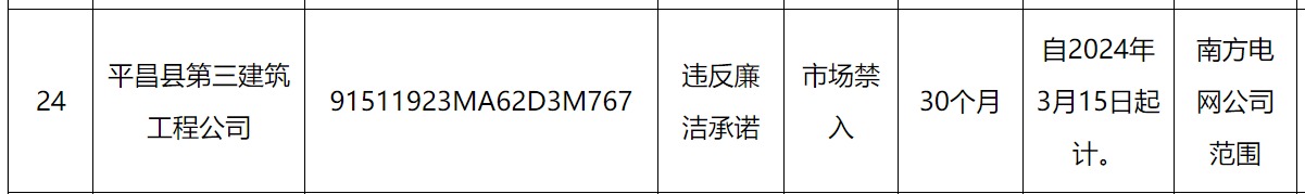 其中,平昌县第三建筑工程公司因被南方电网认定违反廉洁承诺市场禁入,处理期限为自2024年3月15日起计30个月。