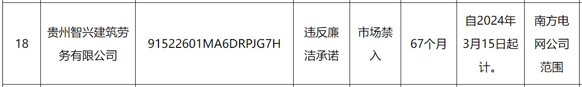 其中,贵州智兴建筑劳务有限公司因被南方电网认定违反廉洁承诺市场禁入,处理期限为自2024年3月15日起计67个月。