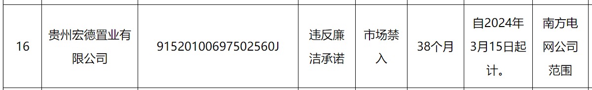 其中,贵州宏德置业有限公司因被南方电网认定违反廉洁承诺市场禁入,处理期限为自2024年3月15日起计38个月。