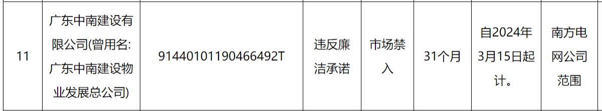 其中,广东中南建设有限公司(曾用名:广东中南建设物业发展总公司)因被南方电网认定违反廉洁承诺市场禁入,处理期限为自2024年3月15日起计31个月。