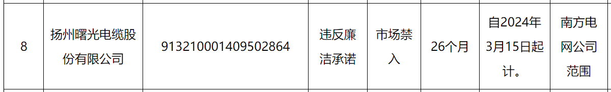 其中,扬州曙光电缆股份有限公司因被南方电网认定违反廉洁承诺市场禁入,处理期限为自2024年3月15日起计26个月。