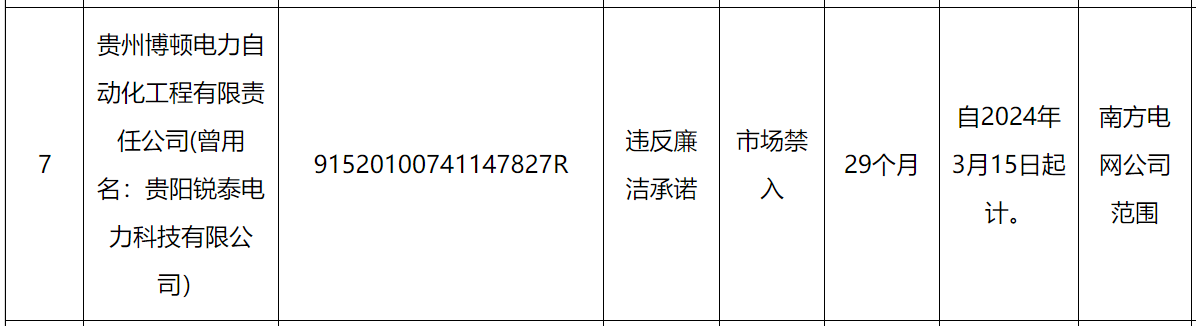 其中,贵州博顿电力自动化工程有限责任公司(曾用名:贵阳锐泰电力科技有限公司)因被南方电网认定违反廉洁承诺市场禁入,处理期限为自2024年3月15日起计29个月。