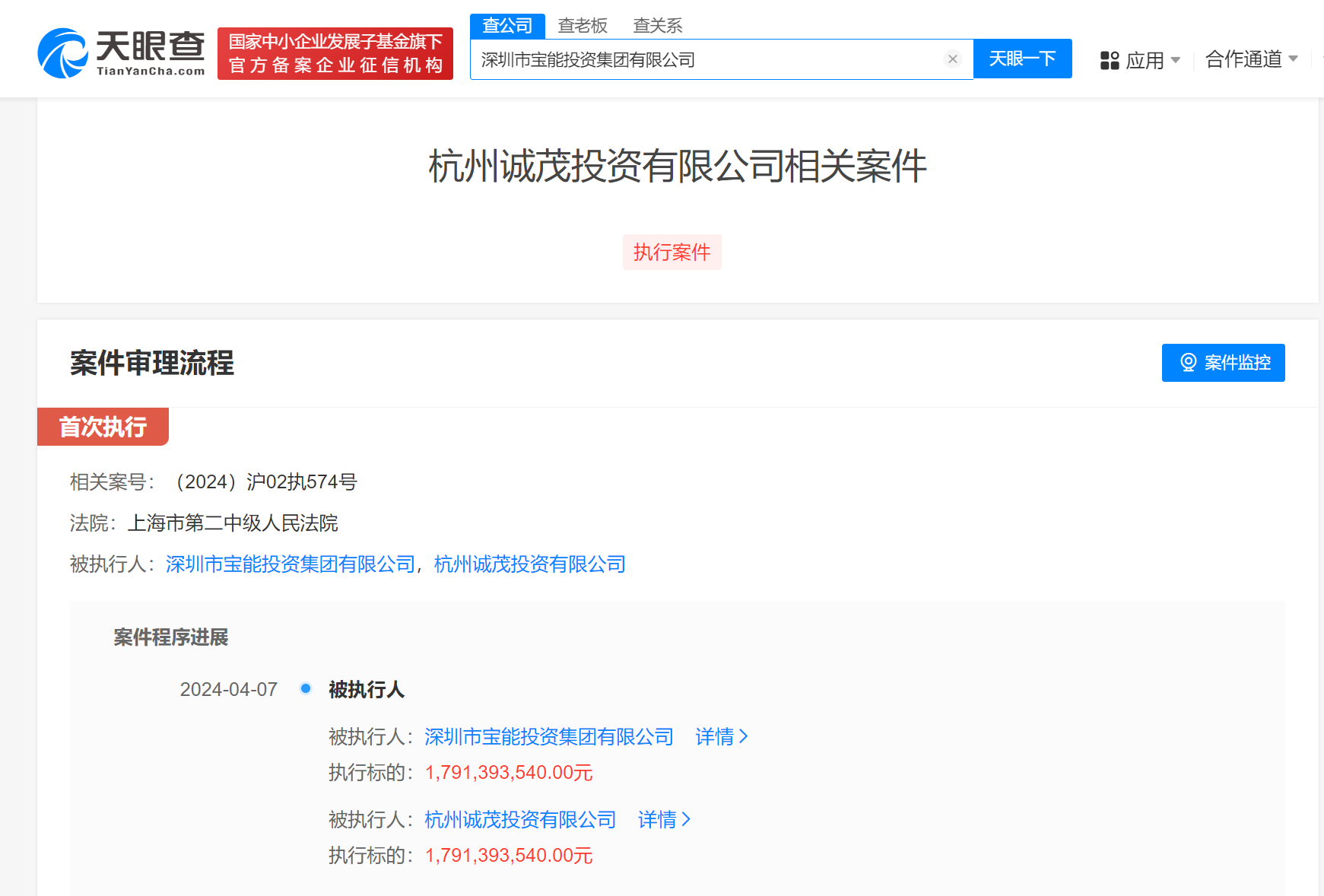 天眼查法律诉讼信息显示,近日,深圳市宝能投资集团有限公司及宝能控股的杭州诚茂投资有限公司新增一则被执行人信息,执行标的17.9亿余元,执行法院为上海市第二中级人民法院。