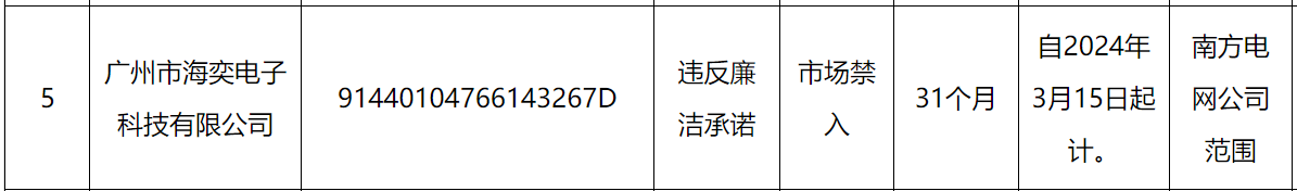 其中,广州市海奕电子科技有限公司因被南方电网认定违反廉洁承诺市场禁入,处理期限为自2024年3月15日起计31个月。