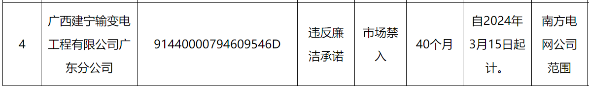 其中,广西建宁输变电工程有限公司广东分公司因被南方电网认定违反廉洁承诺市场禁入,处理期限为自2024年3月15日起计40个月。