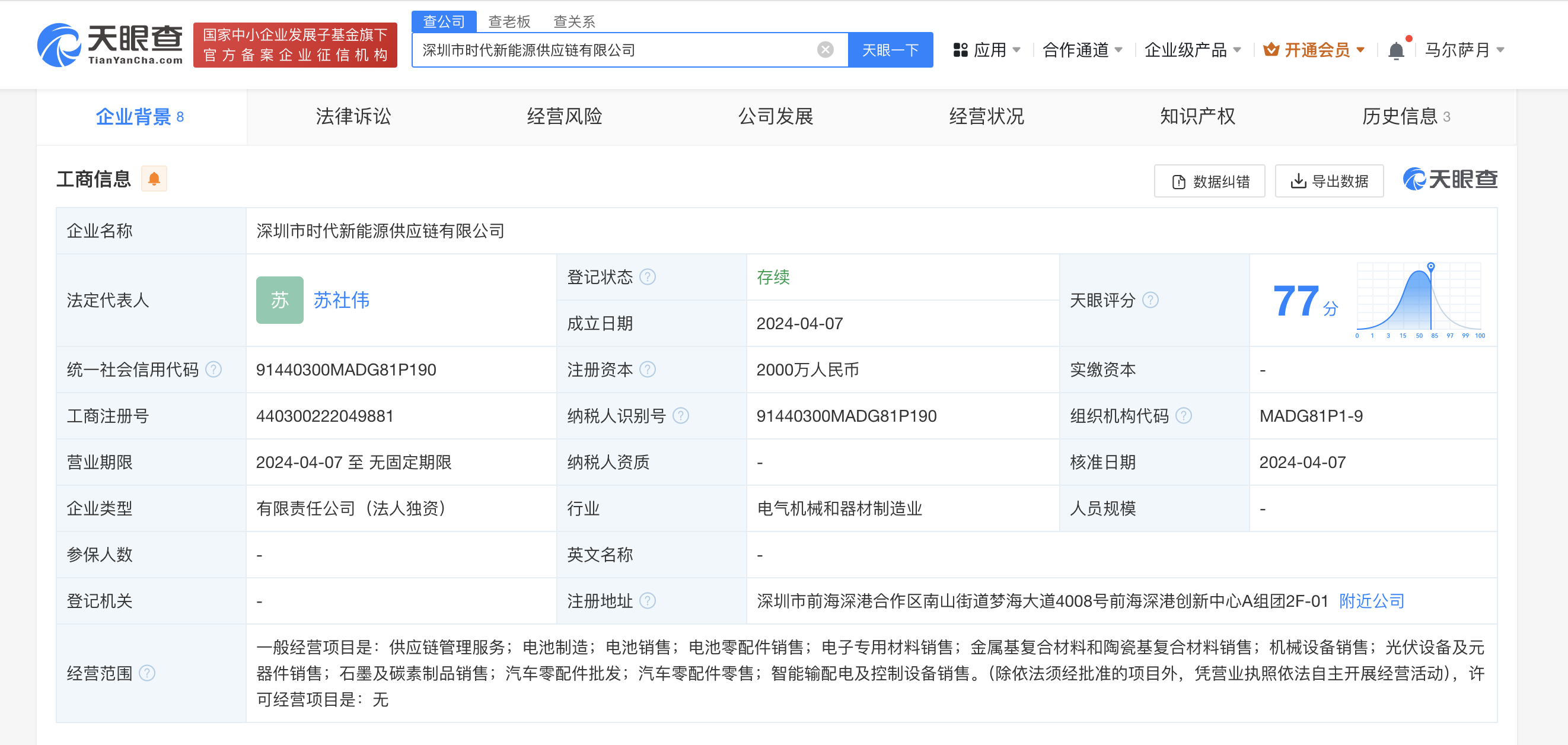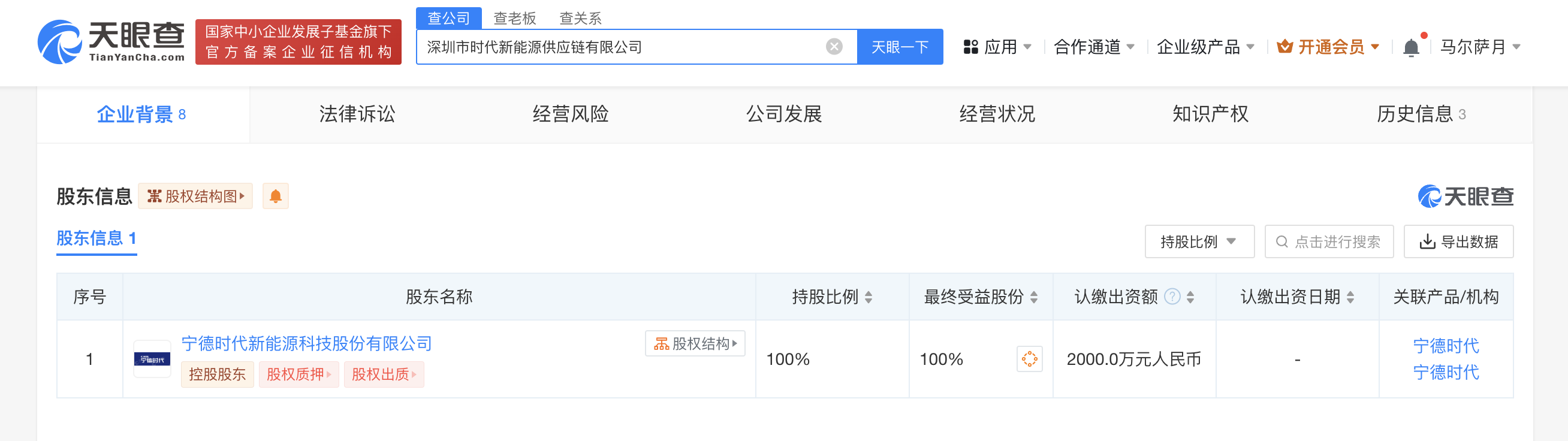天眼查App显示,近日,深圳市时代新能源供应链有限公司成立,法定代表人为苏社伟,注册资本2000万人民币,经营范围含供应链管理服务、电池制造、金属基复合材料和陶瓷基复合材料销售、光伏设备及元器件销售、石墨及碳素制品销售、汽车零配件批发等。股东信息显示,该公司由宁德时代(300750)全资持股。