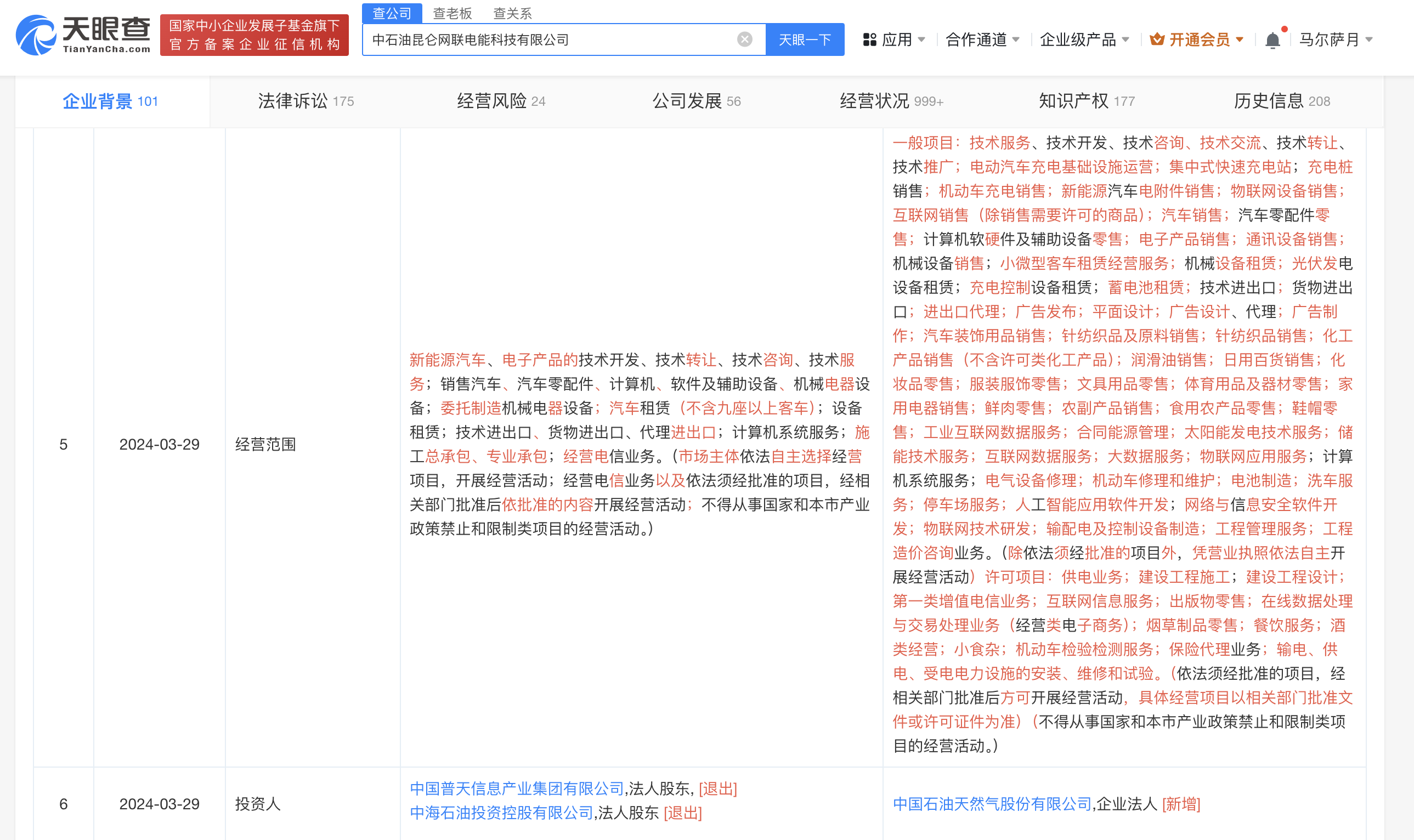 天眼查App显示,近日,普天新能源有限责任公司发生工商变更,中国普天信息产业集团有限公司、中海石油投资控股有限公司退出股东行列,新增中国石油(601857)为全资股东,同时,企业名称变更为中石油昆仑网联电能科技有限公司,多名主要人员发生变更,经营范围新增物联网设备销售、蓄电池租赁、太阳能发电技术服务、人工智能应用软件开发等。