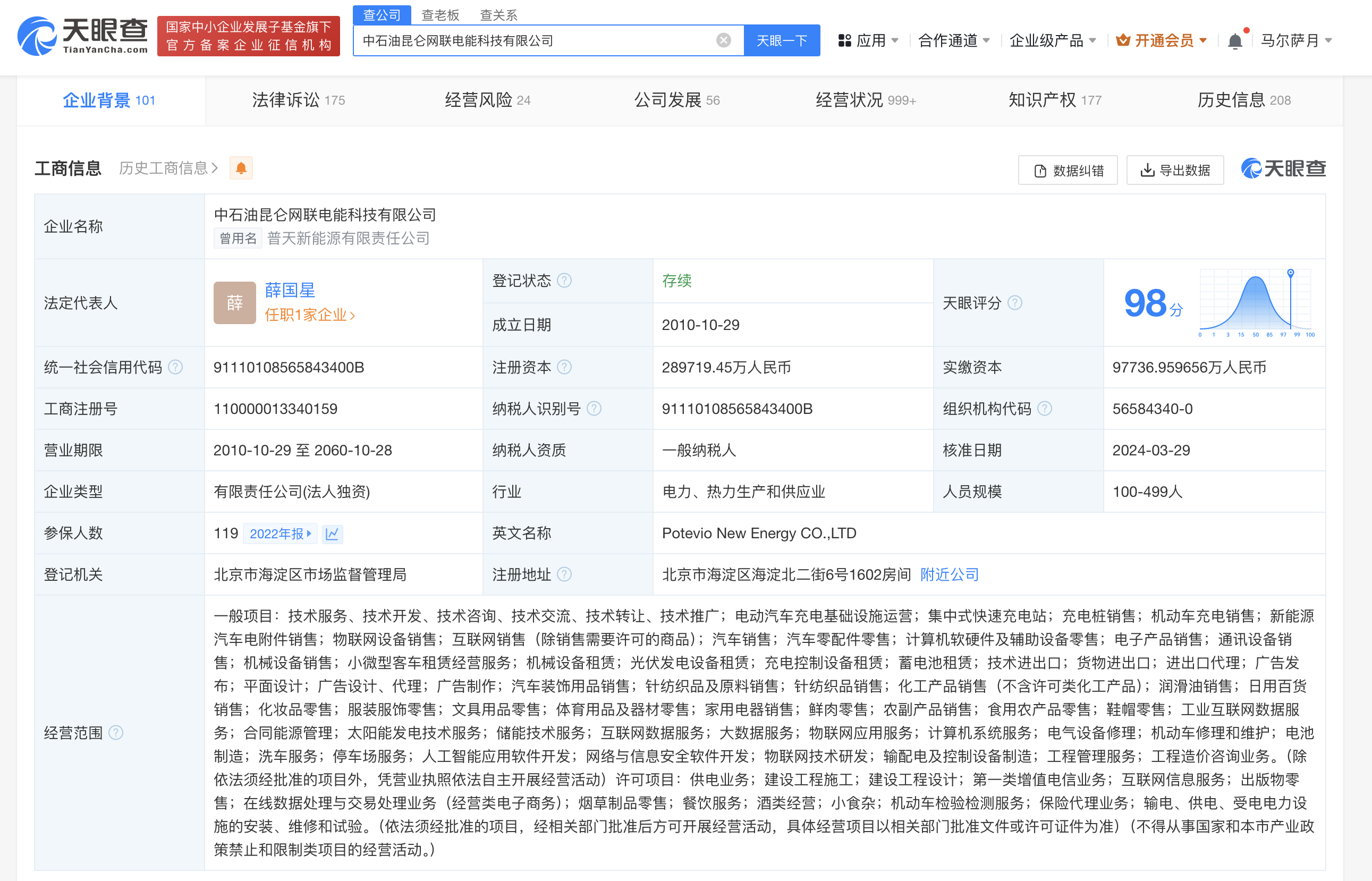 该公司成立于2010年10月,注册资本约28.97亿人民币。媒体去年9月报道称,中石油宣布收购普天新能源有限责任公司100%股权。据悉,普天新能源是中国最早开展充电业务的央属企业,其公共充电桩数量超2万台。